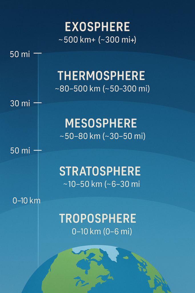- Exosphere – ~500 km+ (300 mi+)